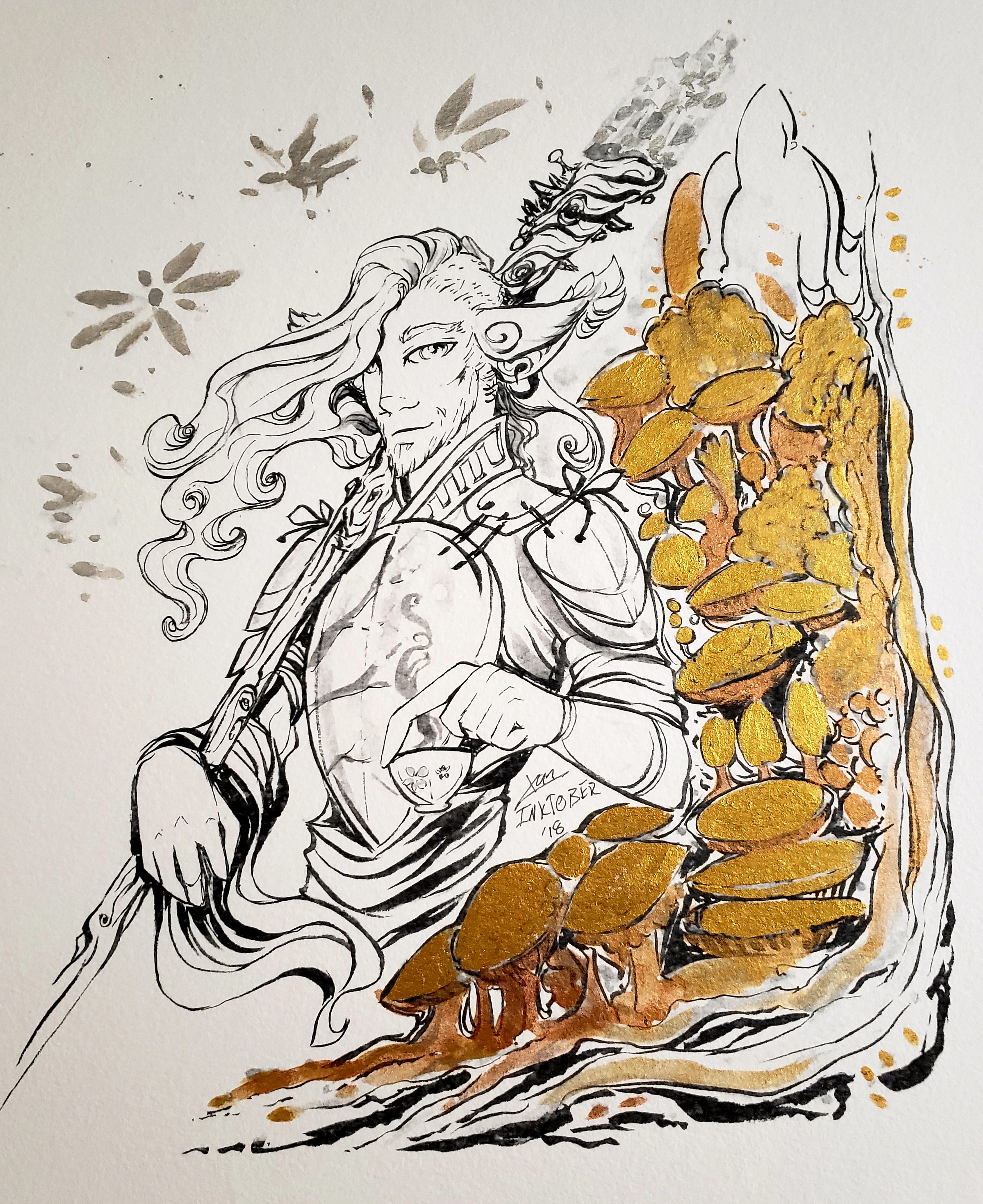 From my inktober series this is Caduceus drinking tea with his spirit animal friends.. This print is hand embellished with silver and several shades of gold ink and metallic watercolor because he's just that fancy.