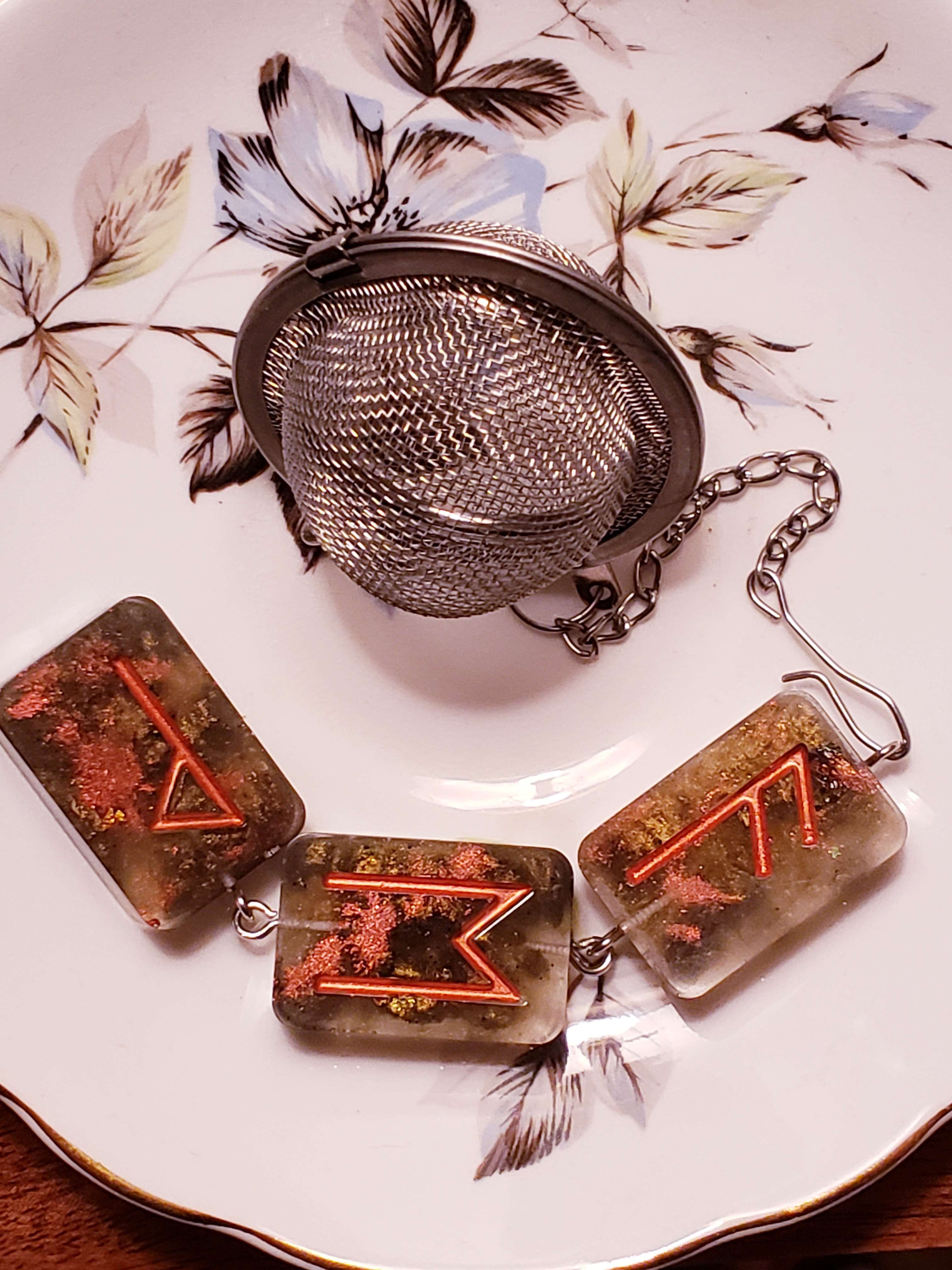 Three hand made and inked rune charms with a tea strainer ball and rune meaning guide.