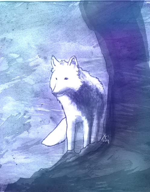Silver white wolf standing against blue. A silent guardian standing watch over snow and ice.